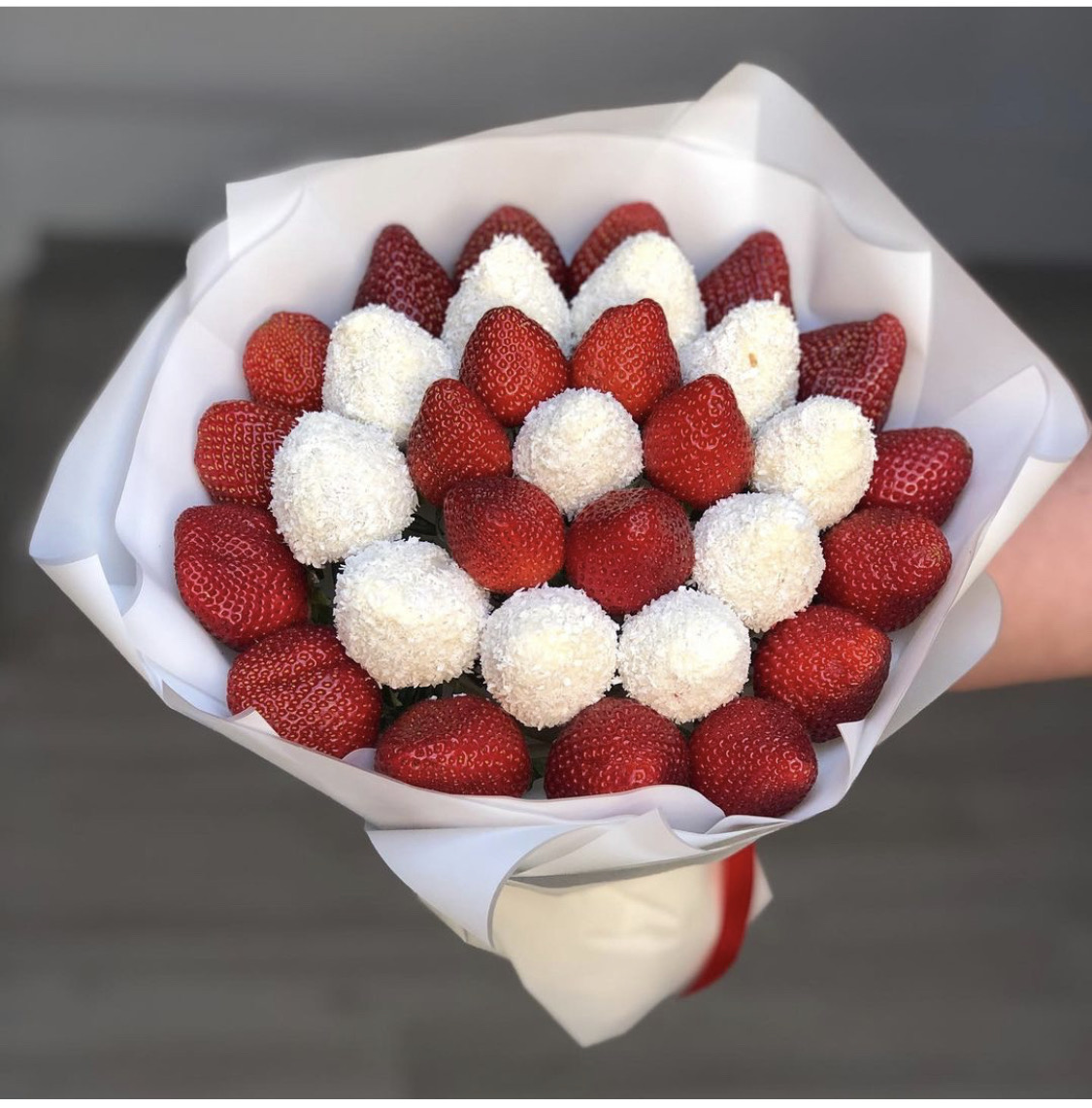 Состав: Свежая клубника - 1 кг 15-17 белых роз Диаметр букета 25 см.